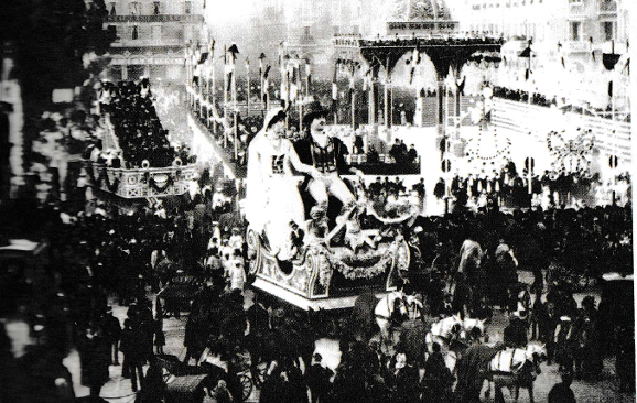 💐 Esta é uma tradição única em Nice, criada em 1876 pelo escritor Alphonse Karr para adicionar um toque de poesia à festa. Aqui, ao contrário do Corso, não tem sátira. Modelos elegantes desfilam em carros adornados com milhares de flores frescas (80% delas cultivadas localmente, como mimosa e lírios). Elas jogam essas flores para o público — uma linda homenagem à herança hortícola da nossa região.